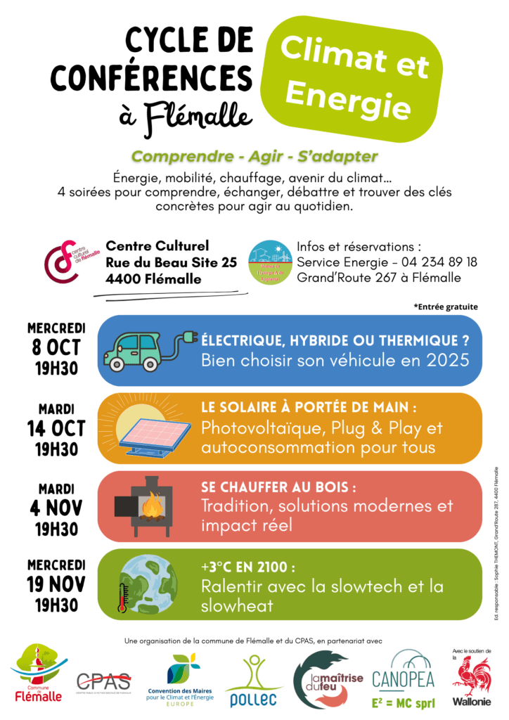 Mercredi 8 octobre 19h30 : “Electrique, hybride ou thermique? Bien choisir son véhicule en 2025” Mardi 14 octobre 19h30 : “Le Solaire à portée de main. Photovoltaïque, Plug & Play et autoconsommation pour tous” Mardi 4 novembre 19h30 : “Se chauffer au bois : tradition, solutions modernes et impact réel” Mercredi 19 novembre 19h30 : “+3°C en 2100 : ralentir avec la slowtech et la slowheat”.