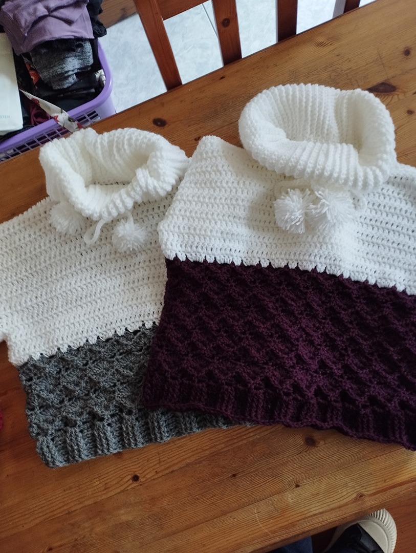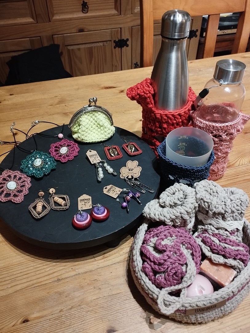 Confection de vêtements (ponchos, châles, pulls, bonnets, écharpes…) et de petits objets du quotidien (porte-monnaie, porte clef…) au crochet, ainsi que des bijoux réalisés avec des objets détournés (boutons, épingle à nourrice, cailloux…)