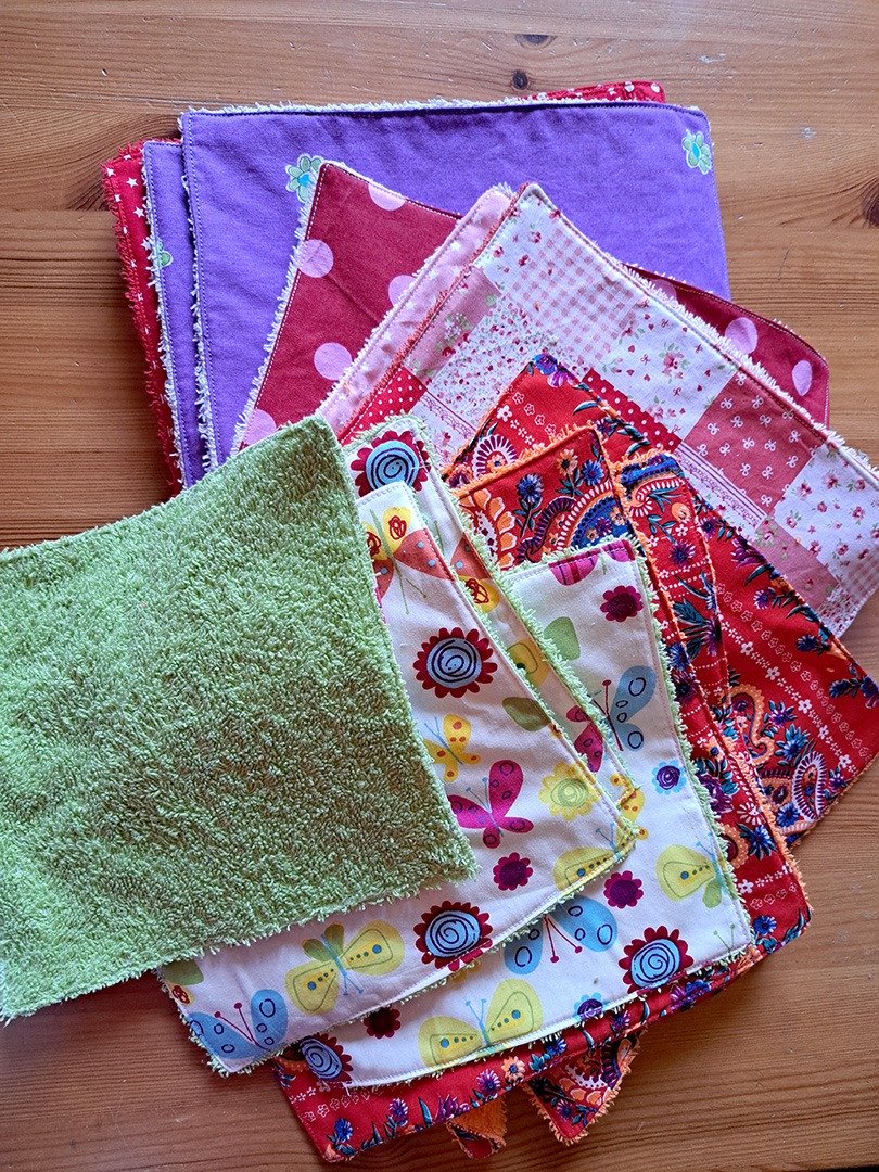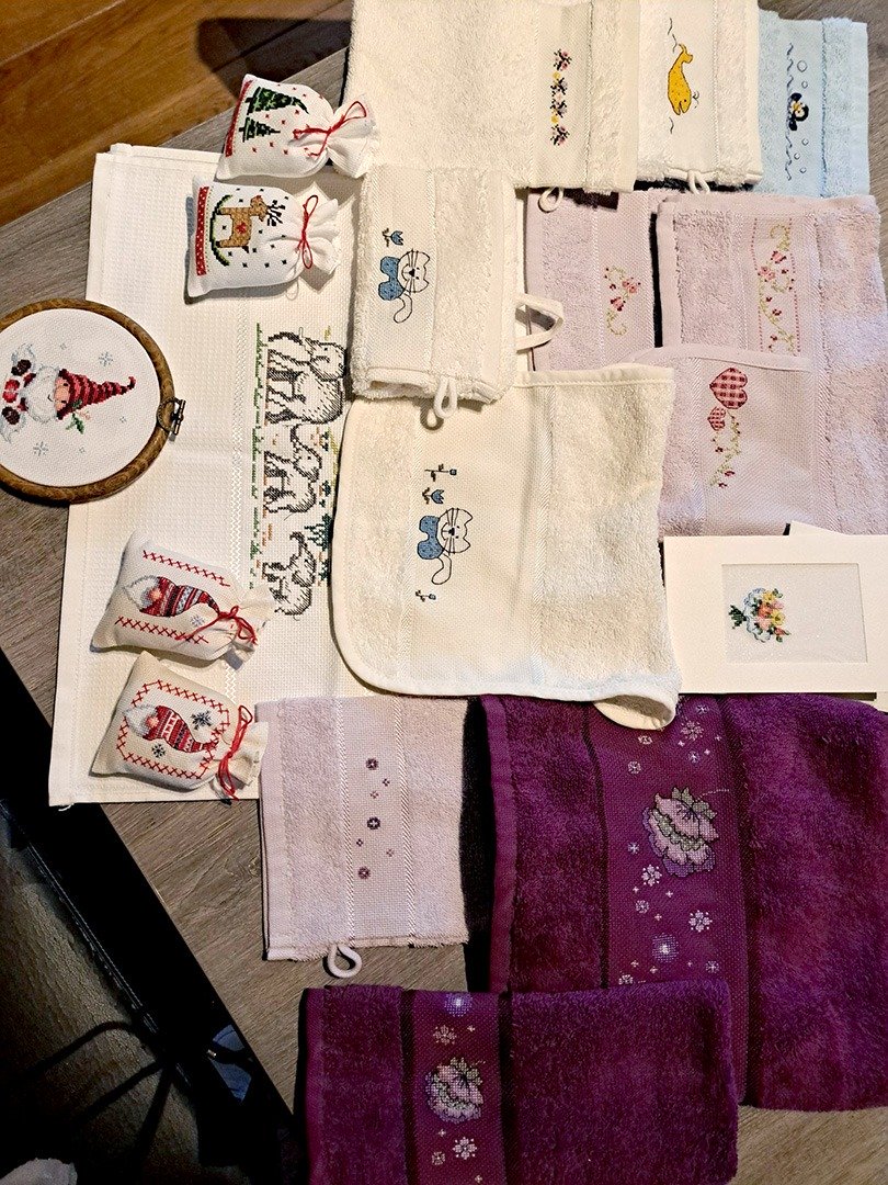 Je réalise mes broderies aux points de croix à la main sur des supports différents. Linge de maison – Linge bébé – Décoration de fêtes. Mes coutures zéro déchet vont des essuie-tout, serviettes hygiéniques, cotons démaquillants, pochettes à livrés, marques pages… tissus différents textures différentes avec le moins de déchets et rien ne va dans mes poubelles…
