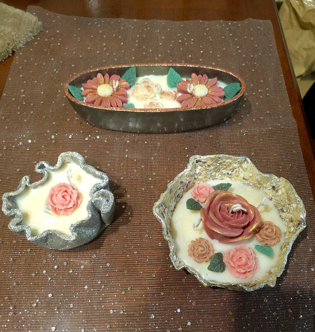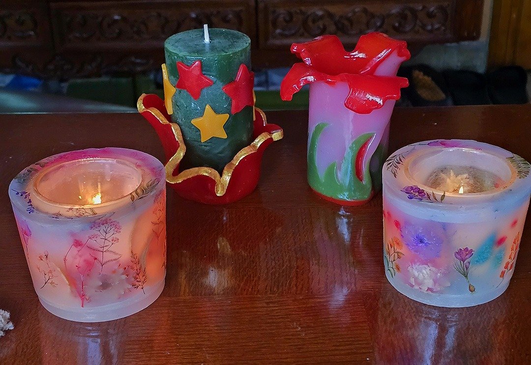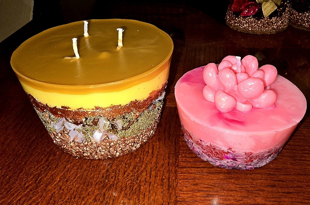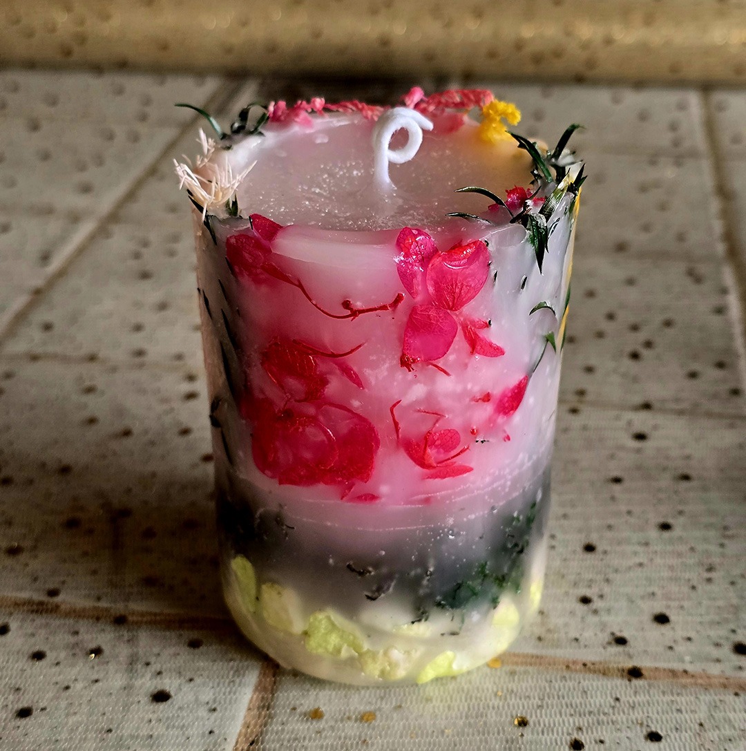 Chaque pièce est conçue comme une petite œuvre décorative : j’utilise différents types de cires, des fleurs séchées, des pétales, des paillettes, ainsi que des formes et des couleurs originales.