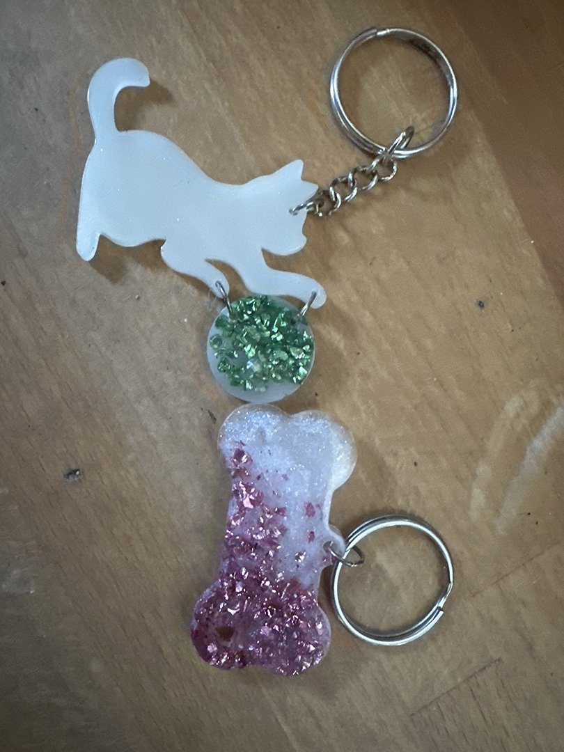 Sur le côté je vous proposerai des portes clés en résine Epoxy sur le thème des chats et des chiens. «avec la possibilité de les personnalisées avec le prénom de vos petits compagnons la moitié des bénéfices sera reverser à l’association « Générosité pour les sans voix »
